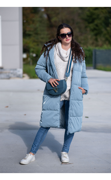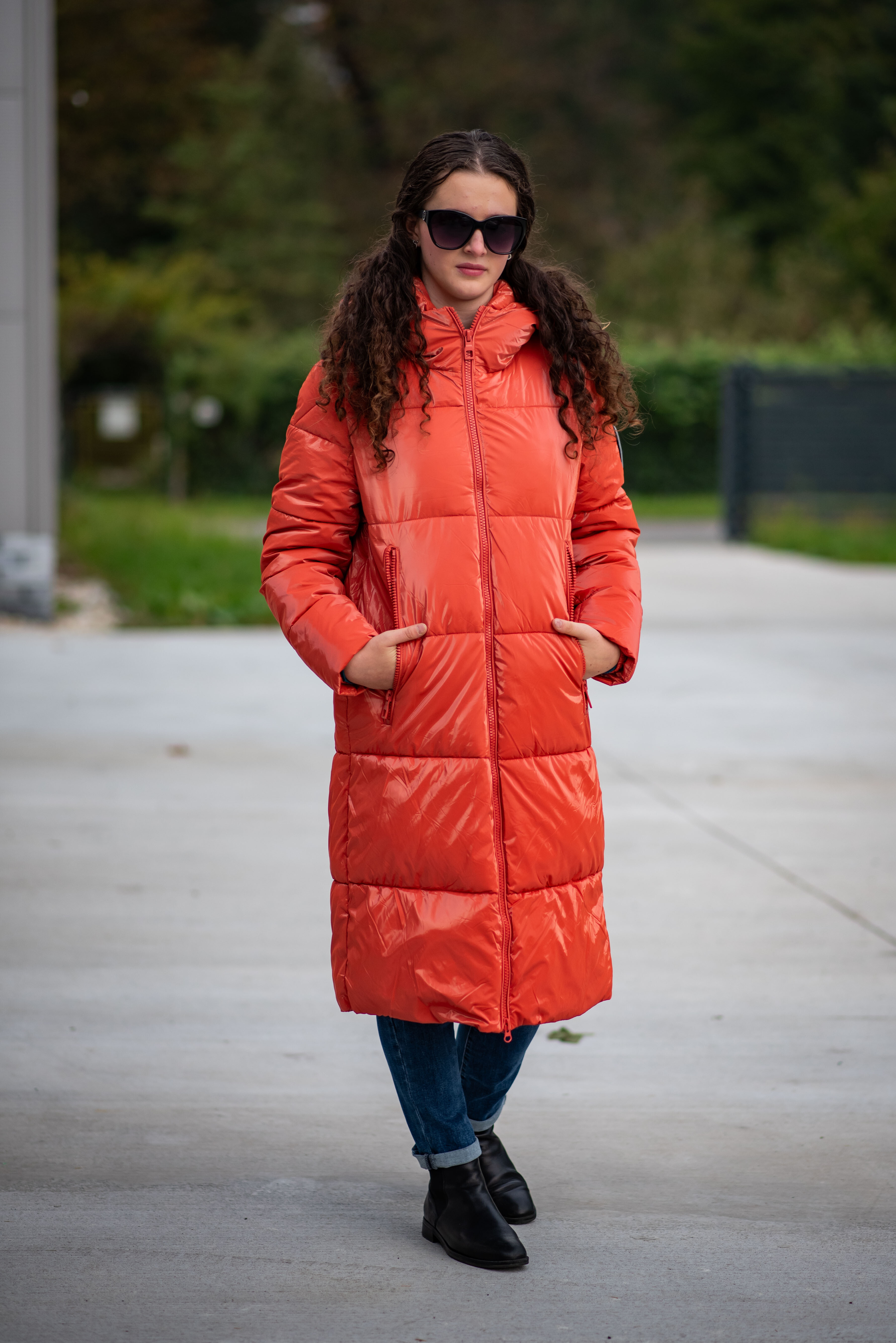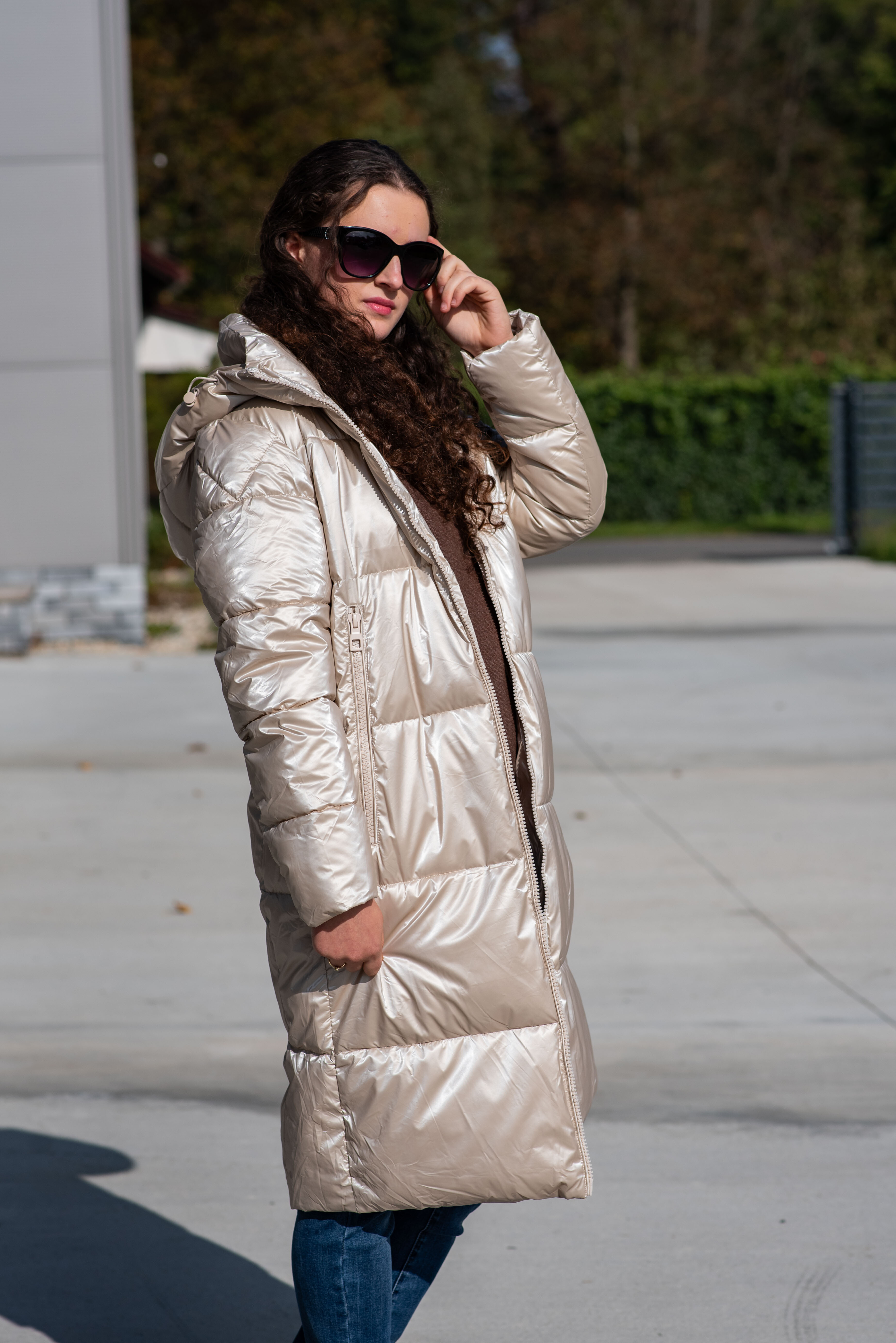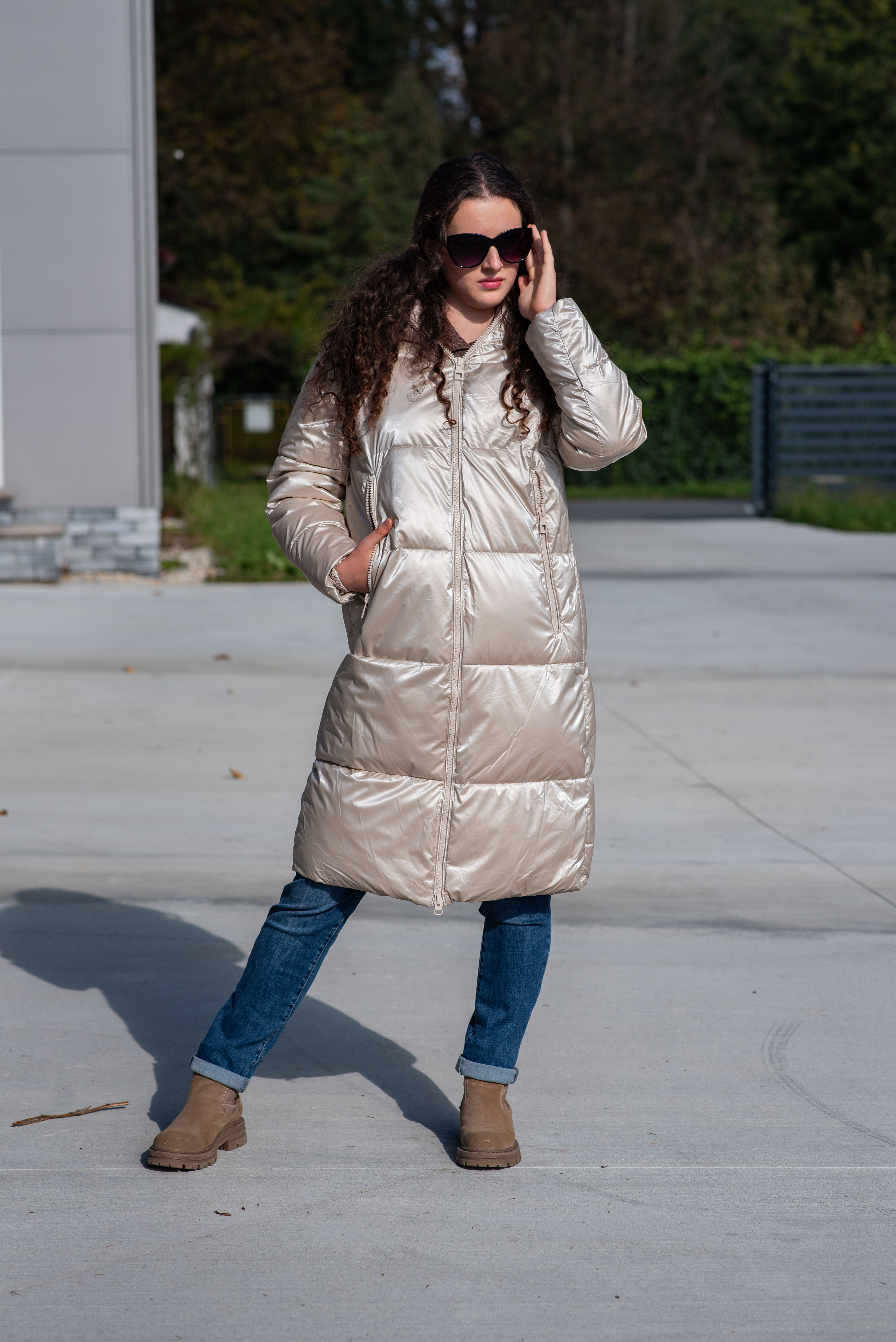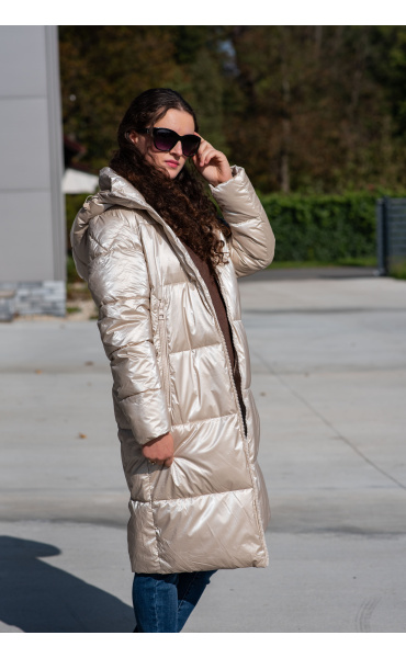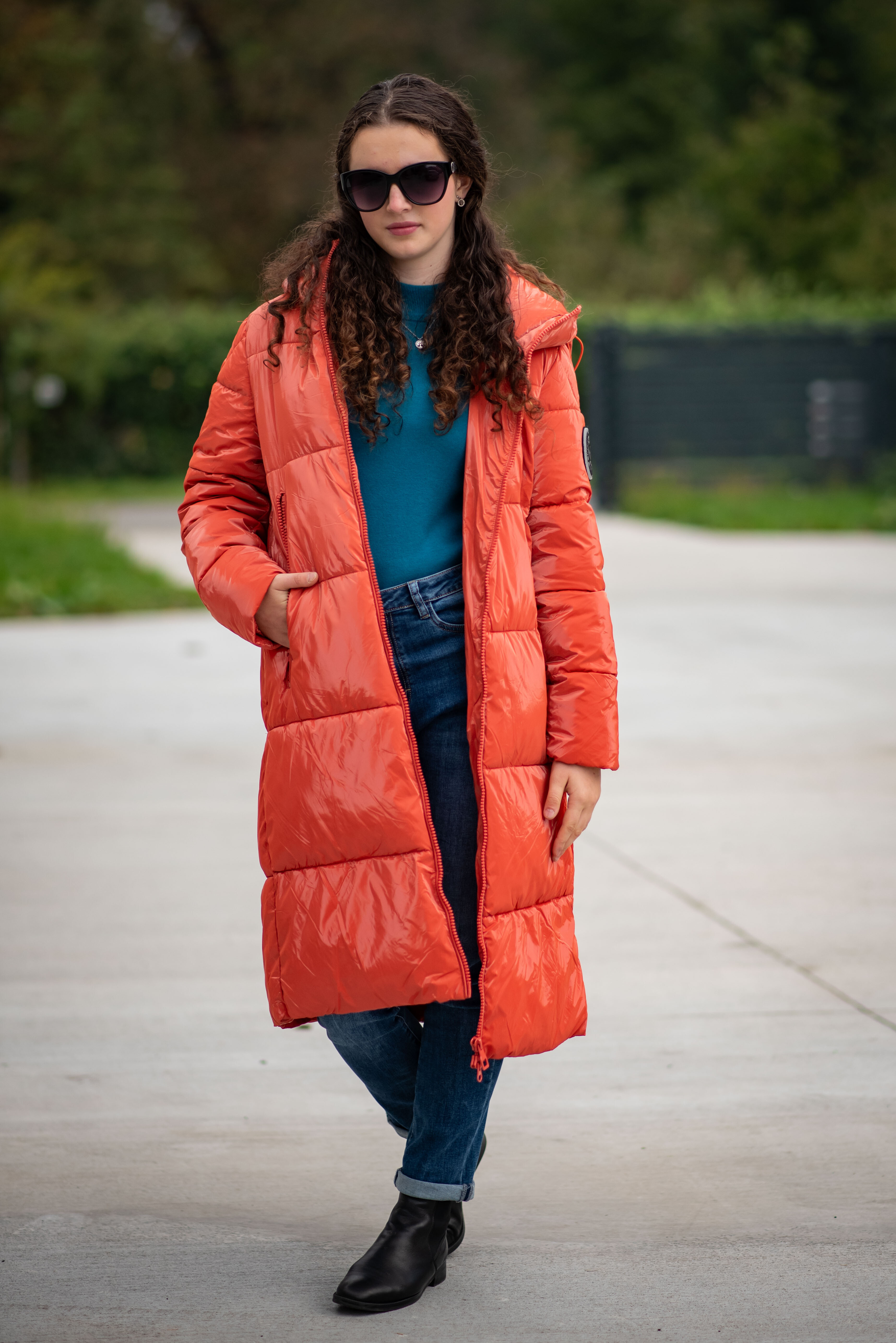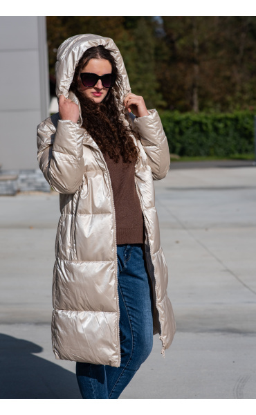 Módní delší zimní bunda s odepínací kapucí , vnitřní kapsa na mobil. Itálie