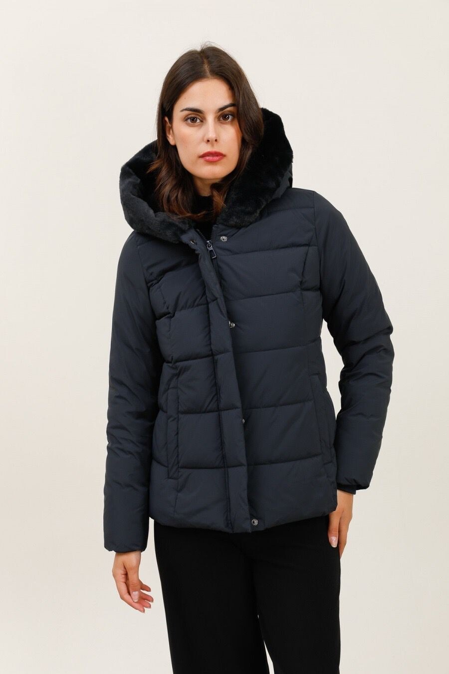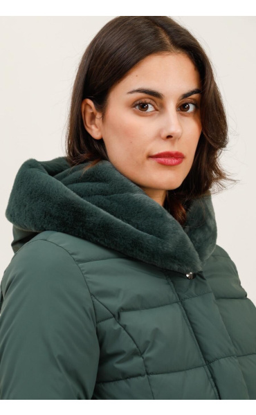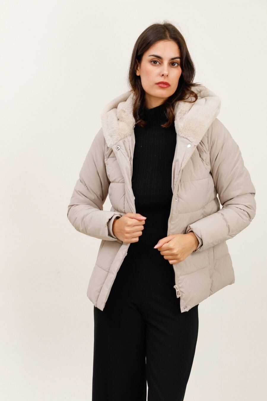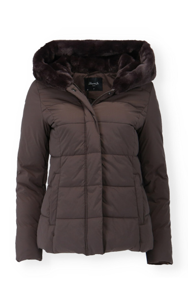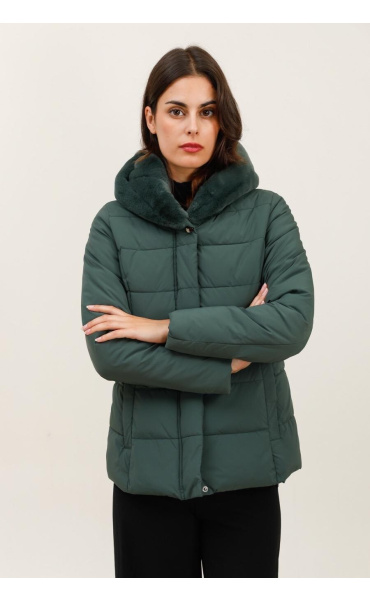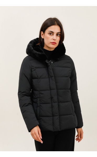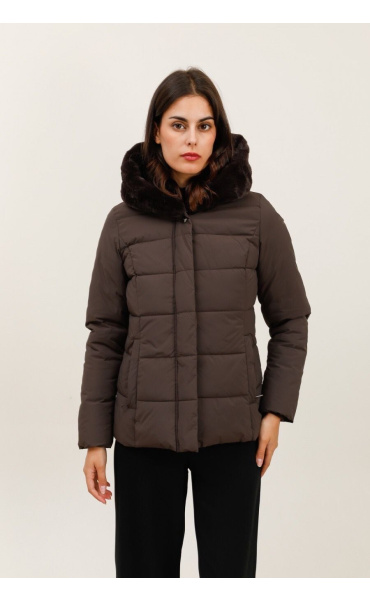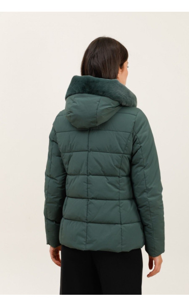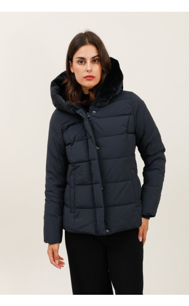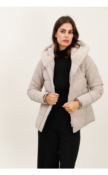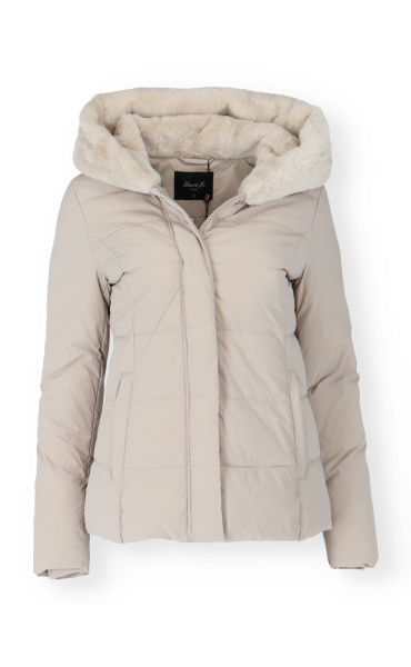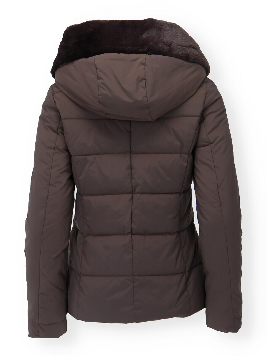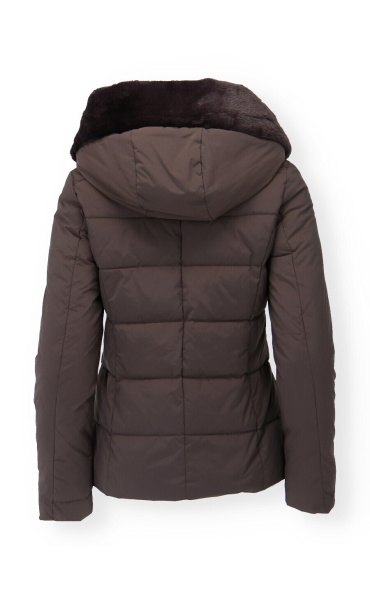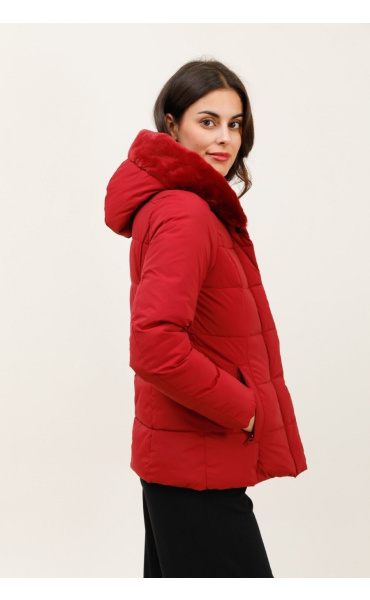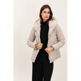 Módní prošívaná zimní bunda krátká. Bunda má zapínání na zip s klopou na druky, kožešinovou kapuci a všité kapsy po stranách.