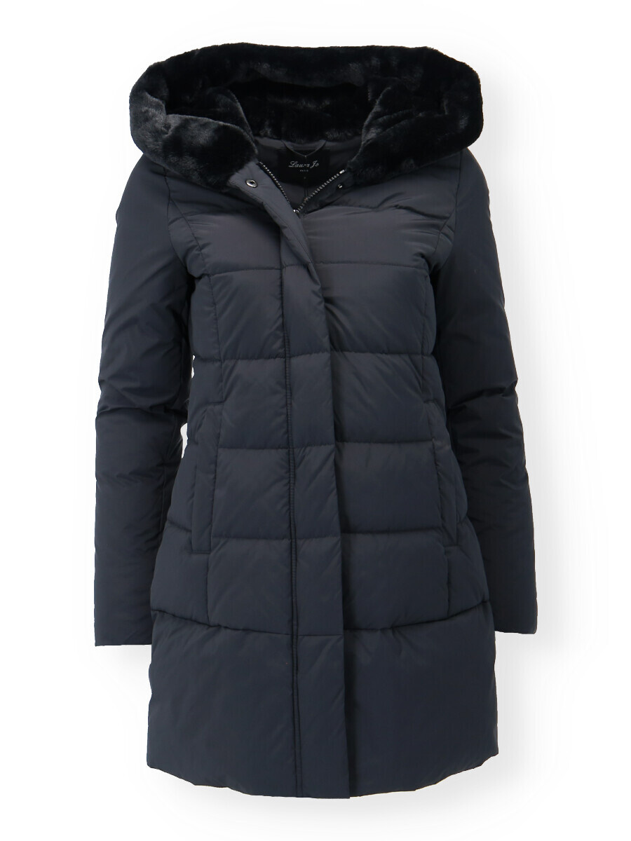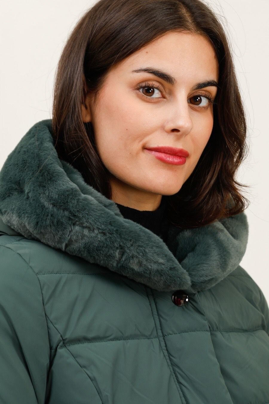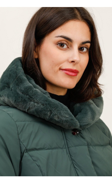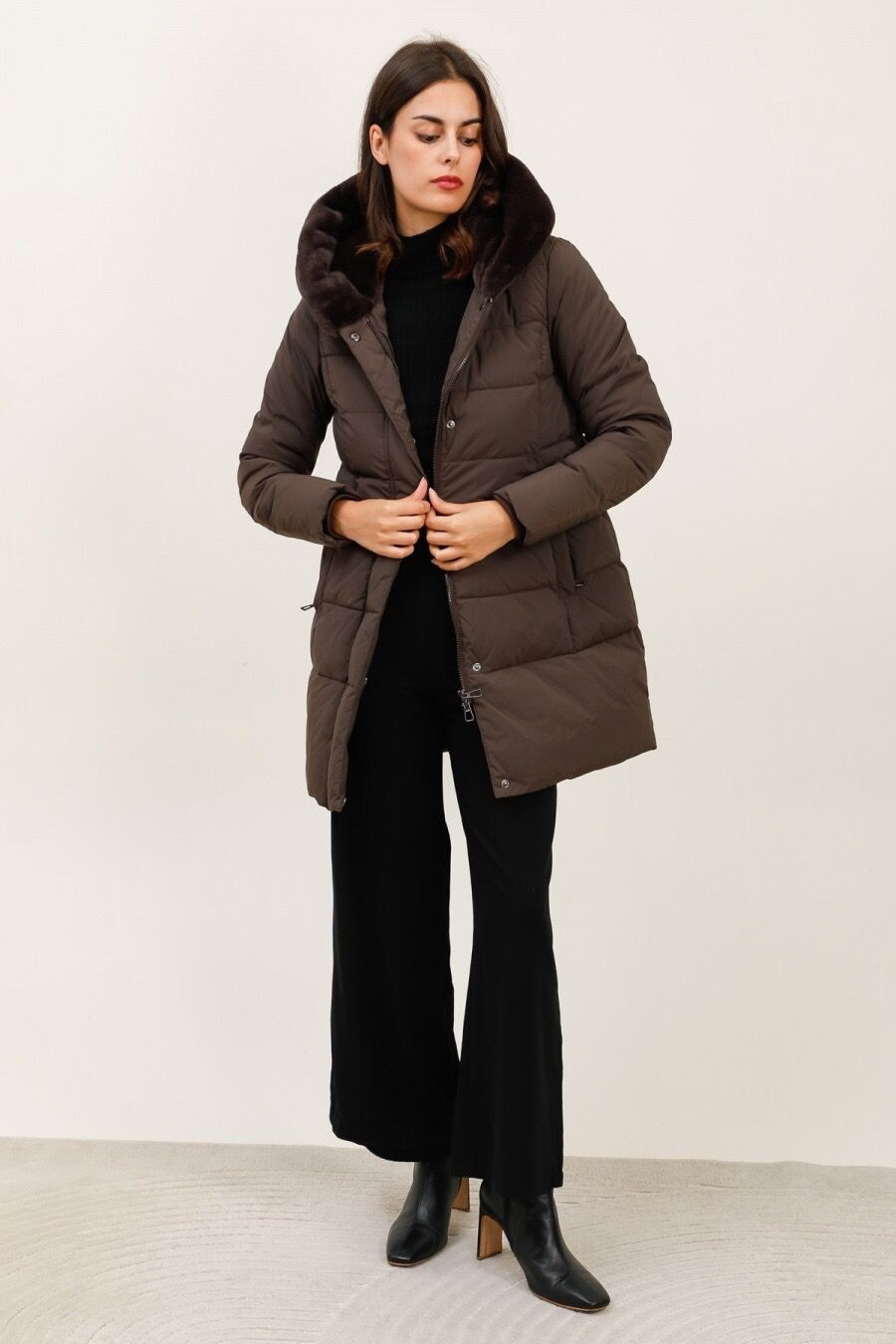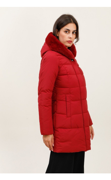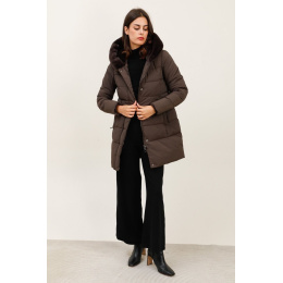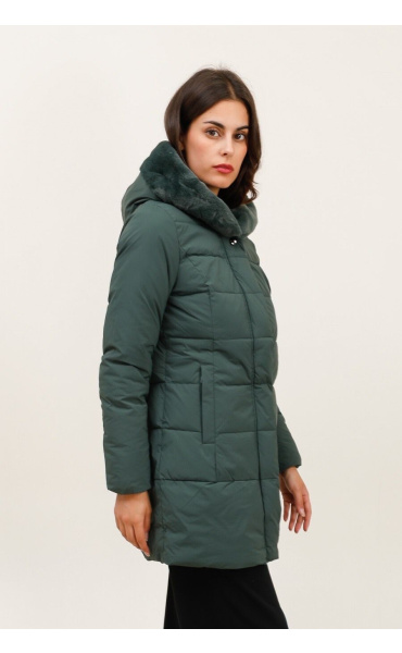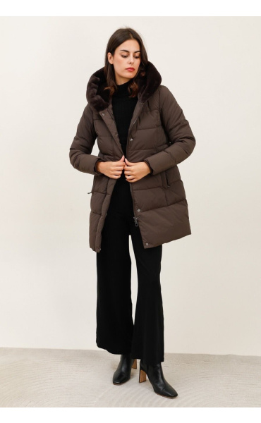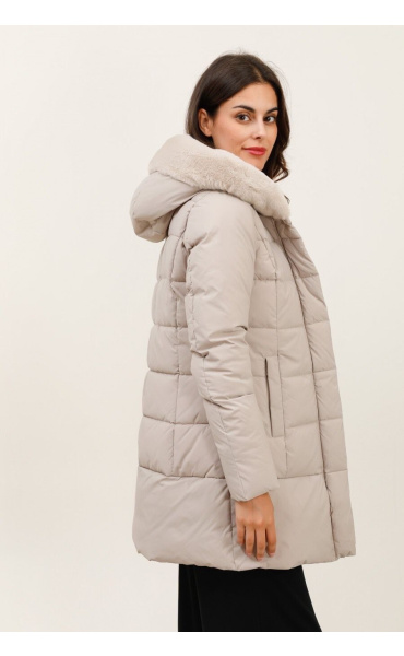Módní prošívaná zimní bunda střední délky pod zadek. Bunda má zapínání na zip s klopou na druky, kožešinovou kapuci a všité kapsy po stranách.