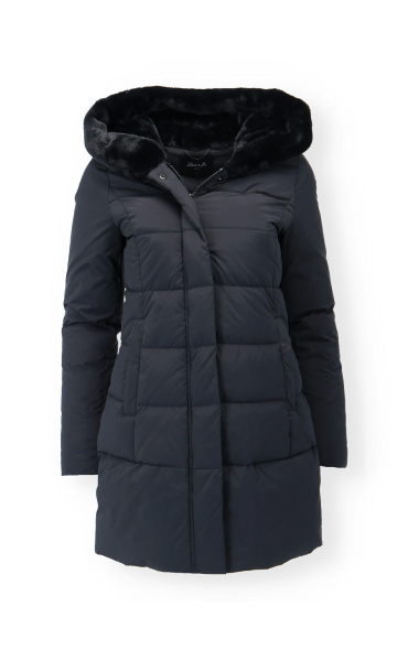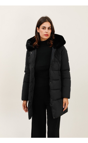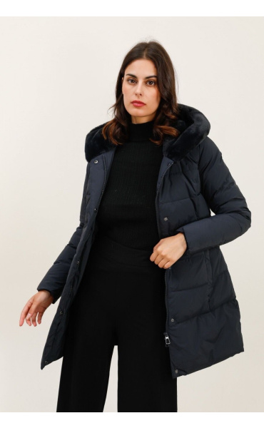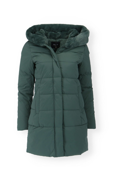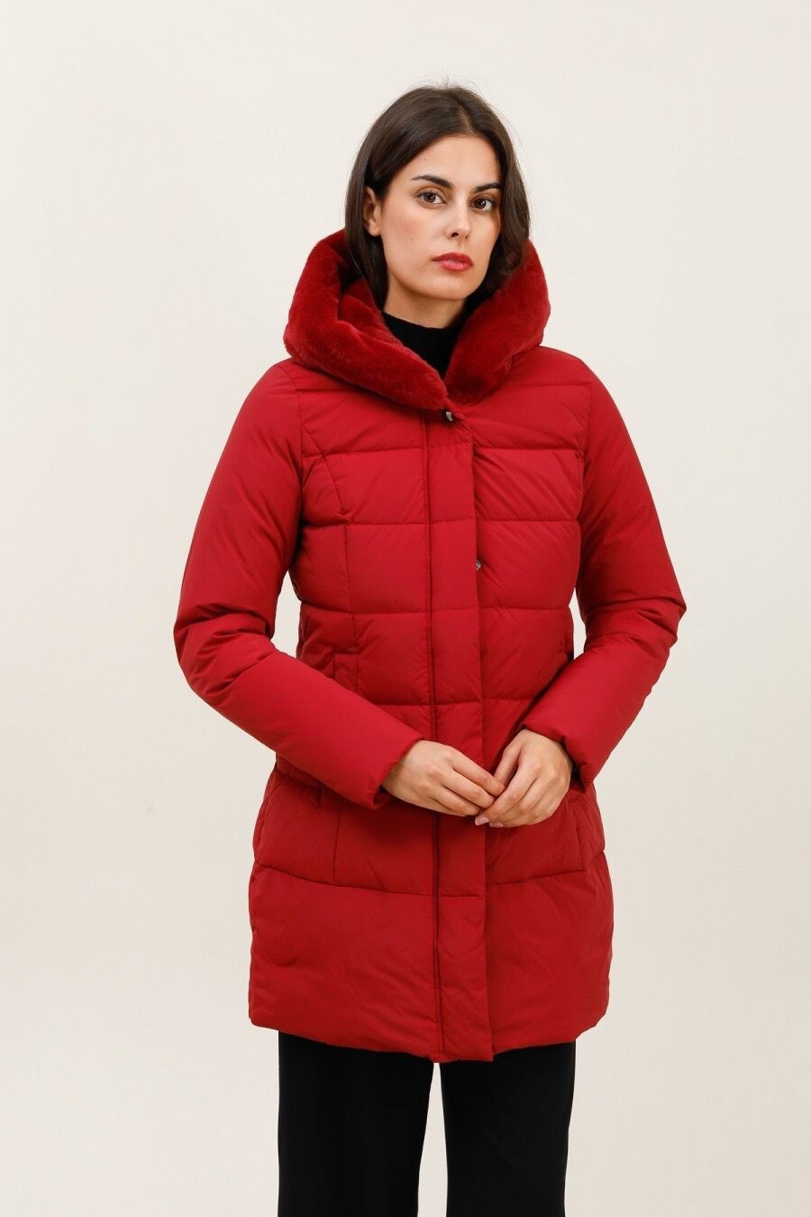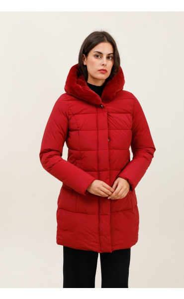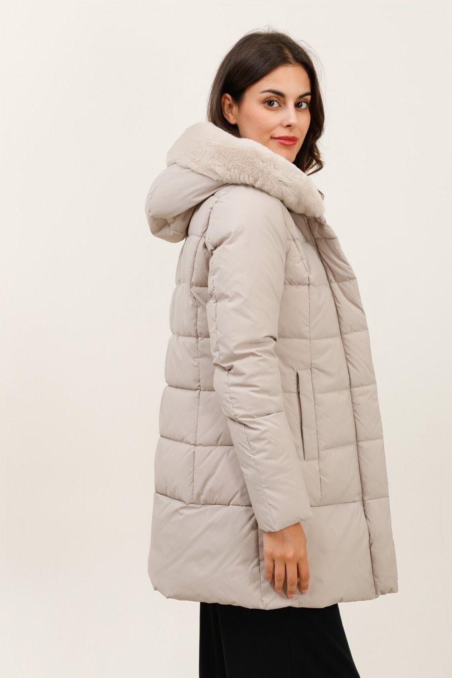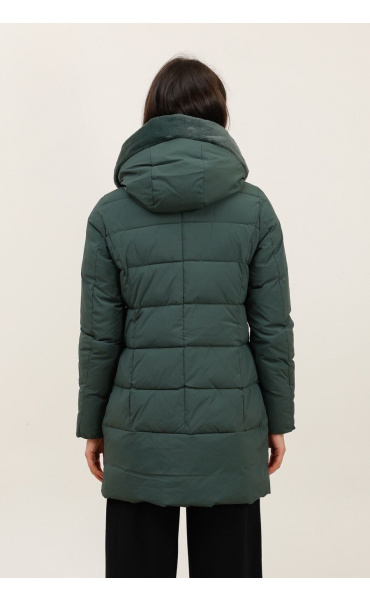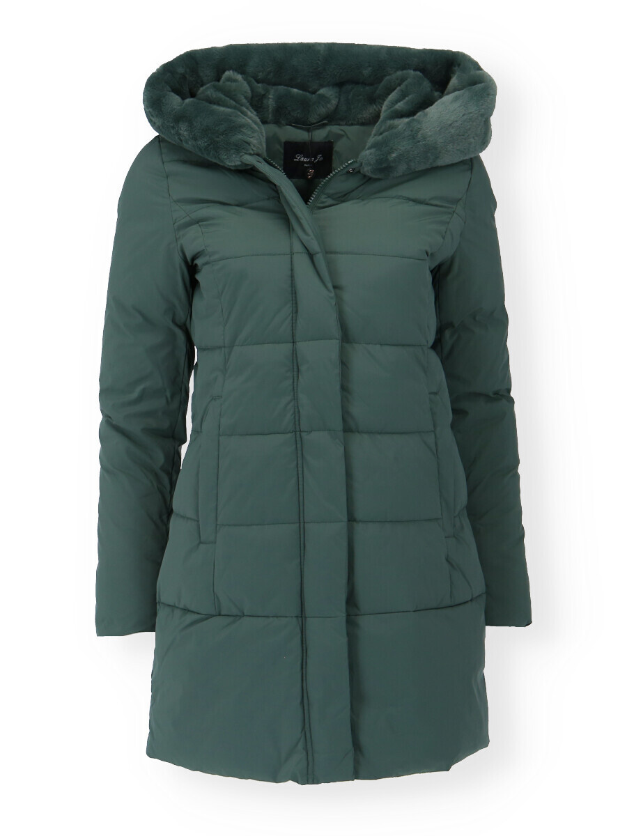 Módní prošívaná zimní bunda střední délky pod zadek. Bunda má zapínání na zip s klopou na druky, kožešinovou kapuci a všité kapsy po stranách.