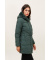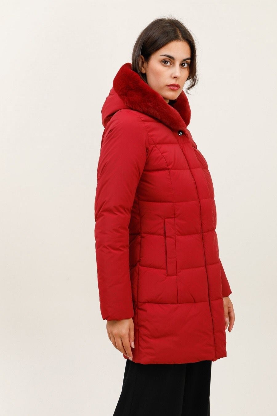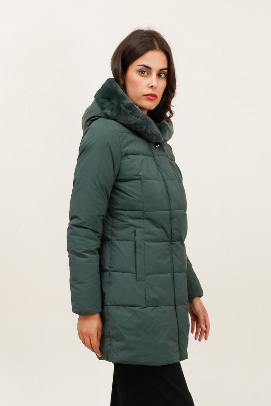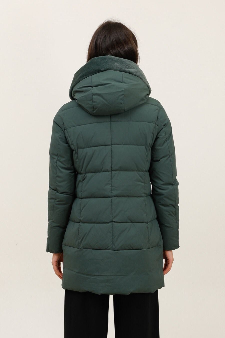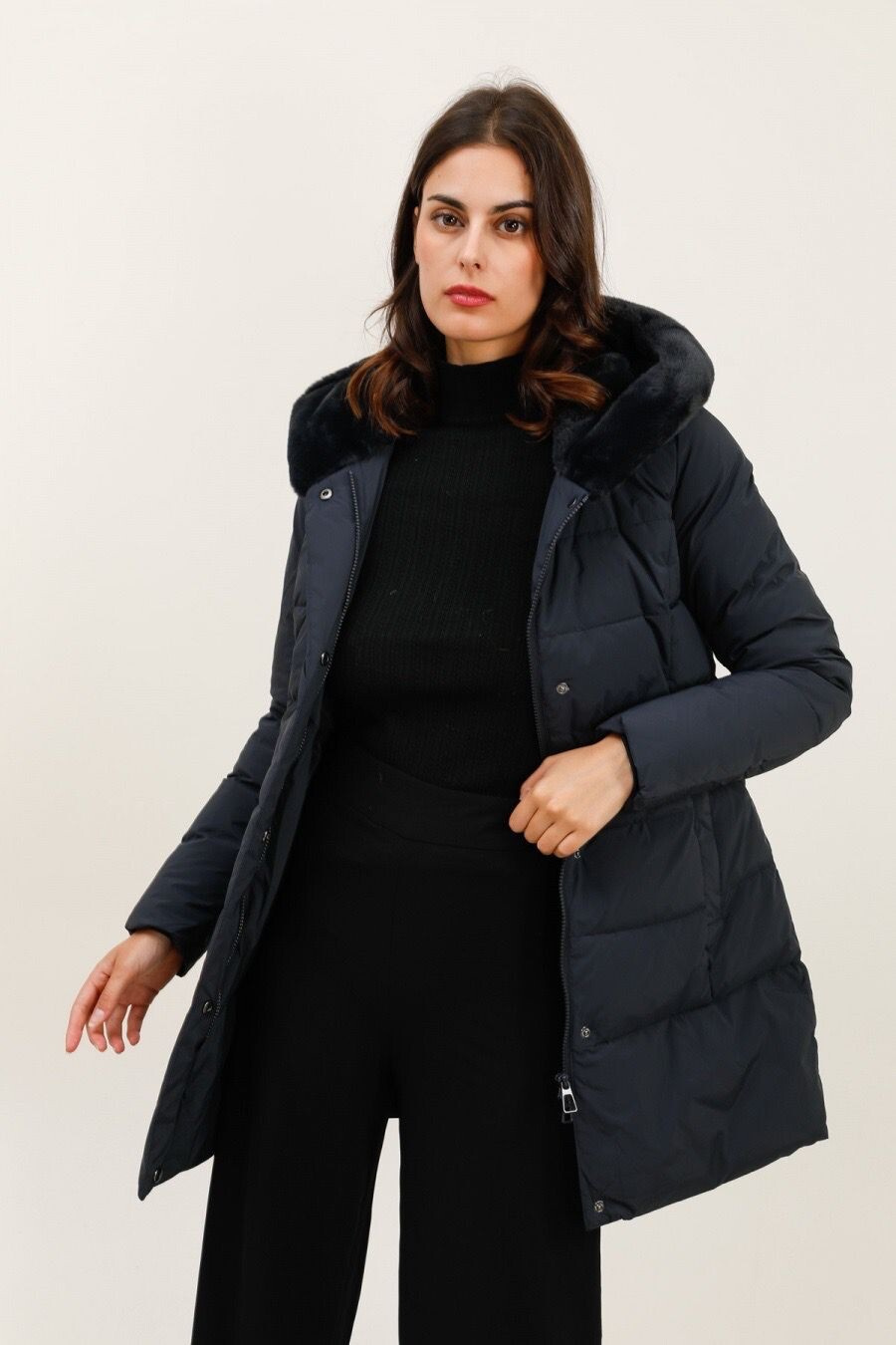 Módní prošívaná zimní bunda střední délky pod zadek. Bunda má zapínání na zip s klopou na druky, kožešinovou kapuci a všité kapsy po stranách.